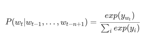 nplm은 단어 시퀀스가 주어졌을때 다음 단어가 무엇인지를 맞추는 과정에 의해 학습된다. 본질은 조건부확률을 이용한 통계량에 있기 때문에 다음 단어가 무엇인지 맞춘다는 말은 아래의 수식을 최대화 한다는 말로 구체화 된다.