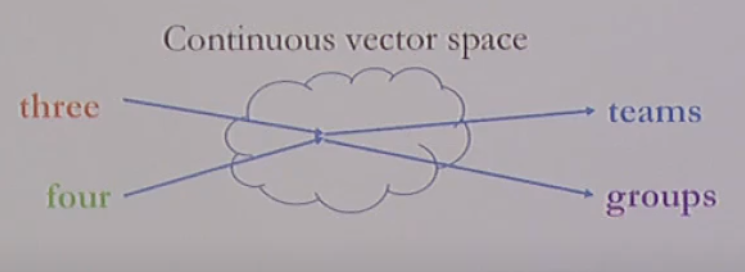 훈련 데이터로 위에 세가지 문장이 들어왔다고 하고 테스트할때 "three" 이 들어왔을때 group의 확률을 예측해야한다고 하자. count based라면 당연히 "three group"의 확률은 0이다. 하지만 neural network에서 continuous vecotr space를 사용한다고 하면
