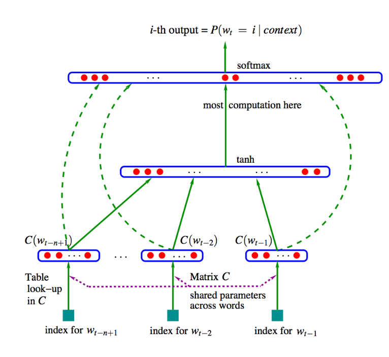 즉, neural network가 "비슷한" n-gram들은 벡터공간에서 가까운 공간에 위치하도록 한다는 것이다. 이때 모델이 판단하는 "비슷"하다는 말의 정의는 n-gram 기반 neural network이기 때문에 n-gram에서 마지막 단어가 비슷하다는 의미이다.