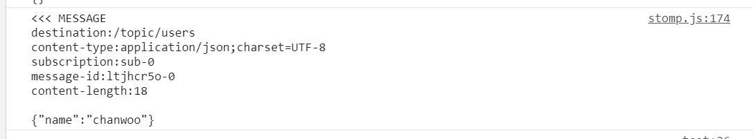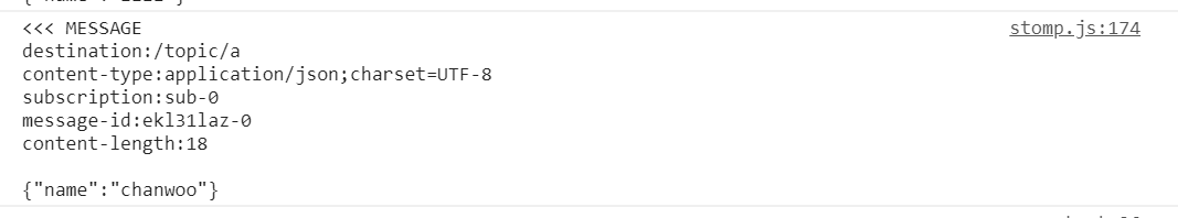 아까 위에서 클라이언트의 id와 일치하는 것을 알 수 있다. STOMP에서는 서버의 모든 메세지는 특정 클라이언트 구독에 응답하여야 하고 서버 메세지의 subscription-id 의 헤더는 클라이언트 구독의 id헤더와 일치해야한다.