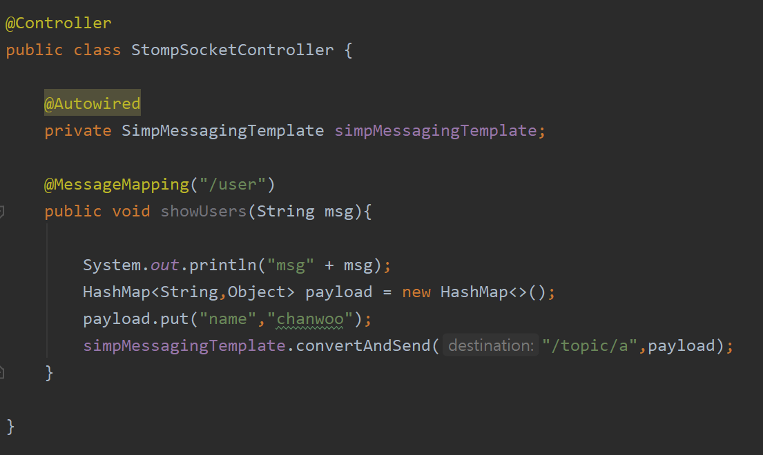클라이언트의 SEND 메소드의 첫번째 인자에서 매핑한대로 컨트롤러가 매핑되어 있는 것을 볼 수 있다. 단 /app은 빠져있는데 이것은 위에 configuration코드에서 /app이 spring으로 흘러가도록 설정해두었기 때문에 생략할 수 있다.