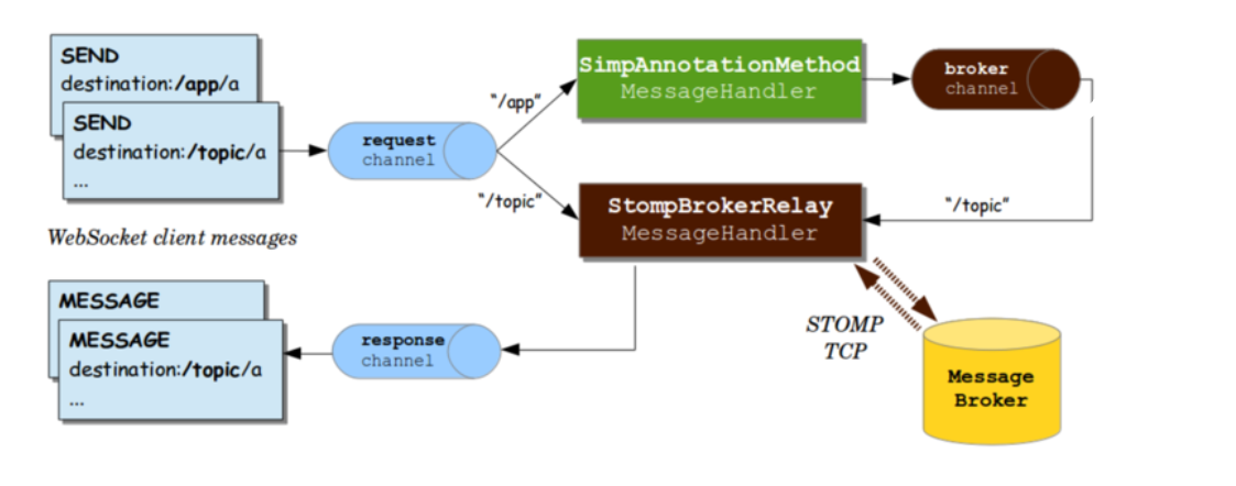 해당 request는 @messagemapping된 스프링 컨트롤러로 흘러가고 컨트롤러에서 메세지를 수신한 후 여러 작업들을 처리한 후에 /topic이라는 prefix를 통해 브로커에게 전달하면 브로커는 STOMP MESSAGE 메소드를 이용해서 특정 토픽을 구독하는 구독자들에게 reponse를 보낸다.