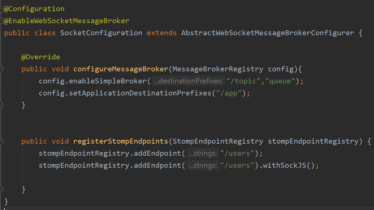 connect를 하는 클라이언트단의 js 코드이다. 처음 소켓을 생성할때 /users라는 이름으로 만드는데 서버쪽의 브로커는 저 주소를 어떻게 알고 connect를 받게 되는 것일까. 바로 socket configuration 자바 코드에서 정의해주는 것이다.