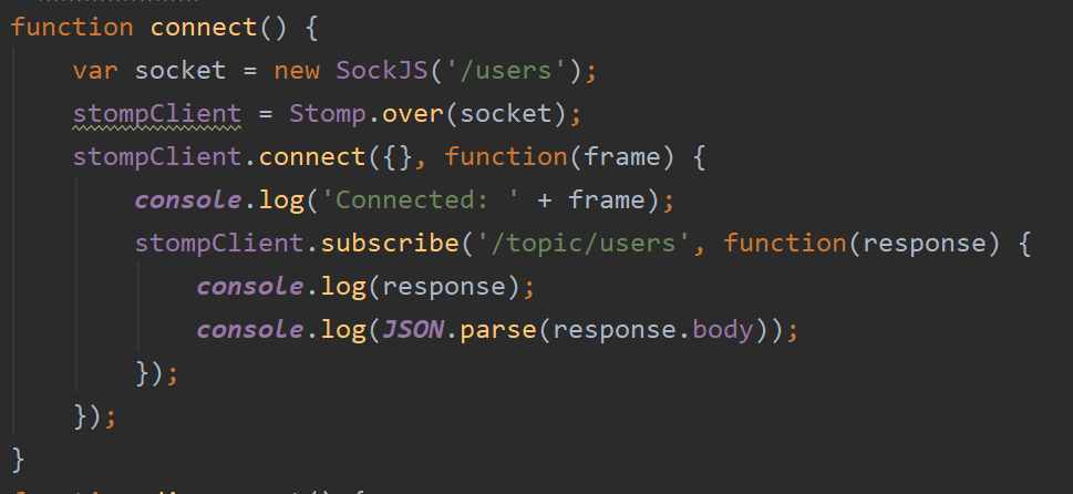 위의 브로커 configuration 코드에서 registerStompEndpoints를 보면 Endpoint를 설정해주는데 이 endpoint를 /users라고 설정해주었기 때문에 위의 클라이언트가 connect 보낸 것을 받을 수 있게 된다.