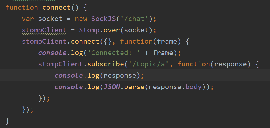 위의 클라이언트 코드에서 stompClient.subscribe 메소드의 인자로 /topic/a 를 주었는데 위에서 설명했듯이 /topic은 브로커에게 흐름을 넘기는 prefix일 뿐이고 뒤에 a를 구독하는 상태이다.
