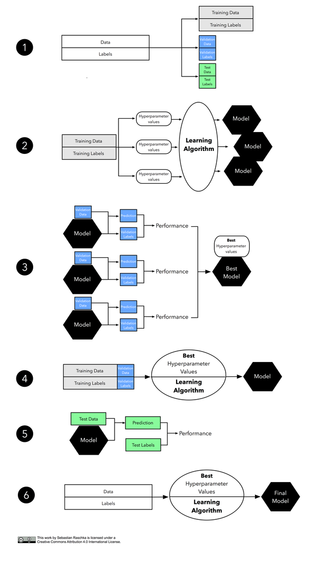 위의 단계를 거쳐서 가장 좋은 모델을 선택하는 것이다. 이때 가설공간안의 모델등의 성능을 평가할때 사용하는 데이터셋은 흔히 validation data라고 하는 데이터셋을 사용한다. 이러한 성능평가에는 cross validation 등 여러 방법이 있다.